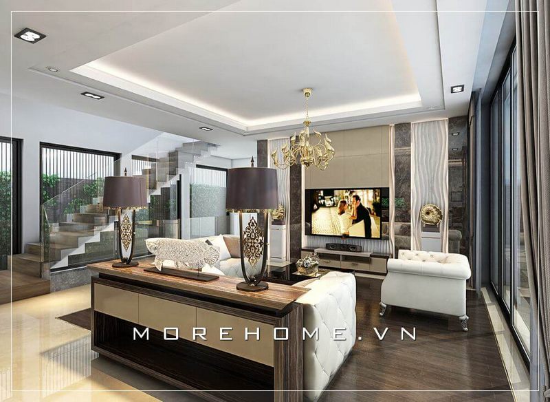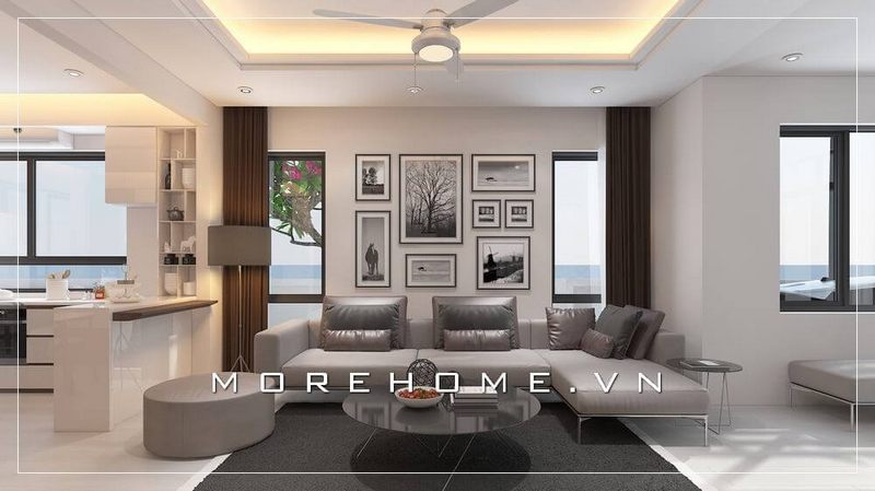 Thu hút với bộ sofa màu trắng tinh tế bọc da cao cấp và lối thiết kế hiện đại trẻ trung thoải mái giữa không gian phòng khách chung cư