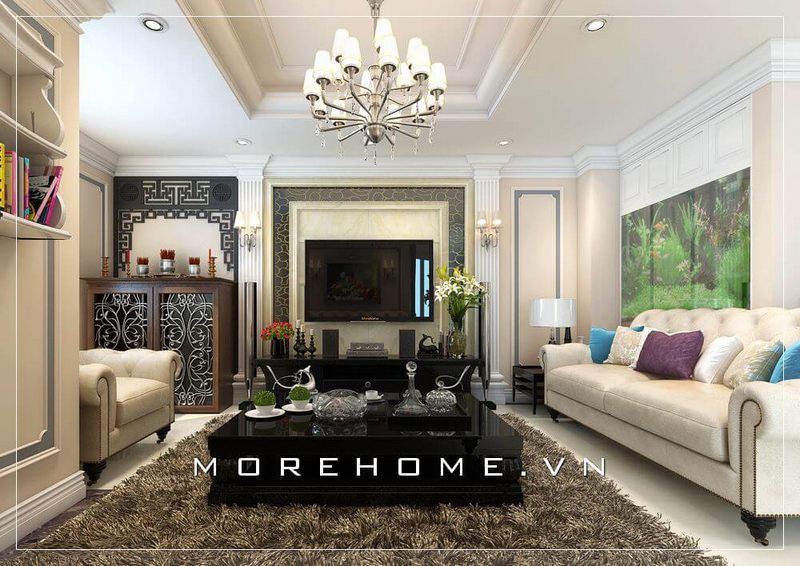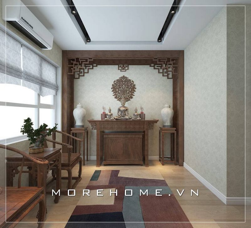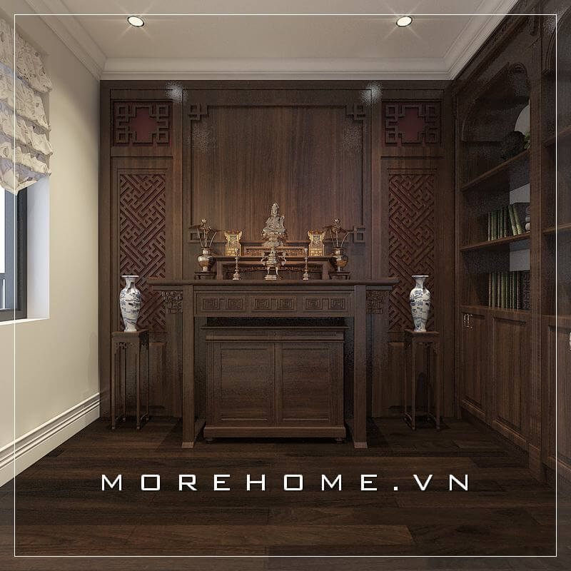 Vị trí bàn thờ chung cư, tủ thờ chung cư được thiết kế và thi công liền kề với không gian phòng khách. Morehome thi công hoàn thiện bàn thờ gia tiên hiện đại bằng gỗ tần bì nhập khẩu phun sơn màu cánh gián đẹp cho căn hộ chung cư Thăng Long Number One tại hà nội