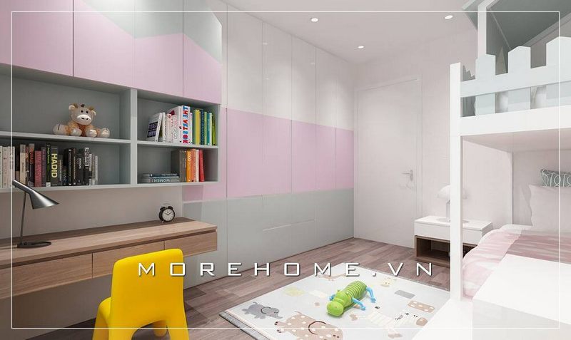 Tủ áo gỗ sơn màu hồng, phù hợp với các bé gái, được thi công trong dự án chung cư Eco Dream.