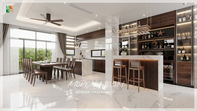 Ý tưởng trang trí nội thất cho phòng bếp, ăn của biệt thự, nhà phố hiện đại là sự rộng rãi và đẳng cấp của người sở hữu được thể hiện qua các món đồ nội thất gỗ óc chó nâu cao cấp.