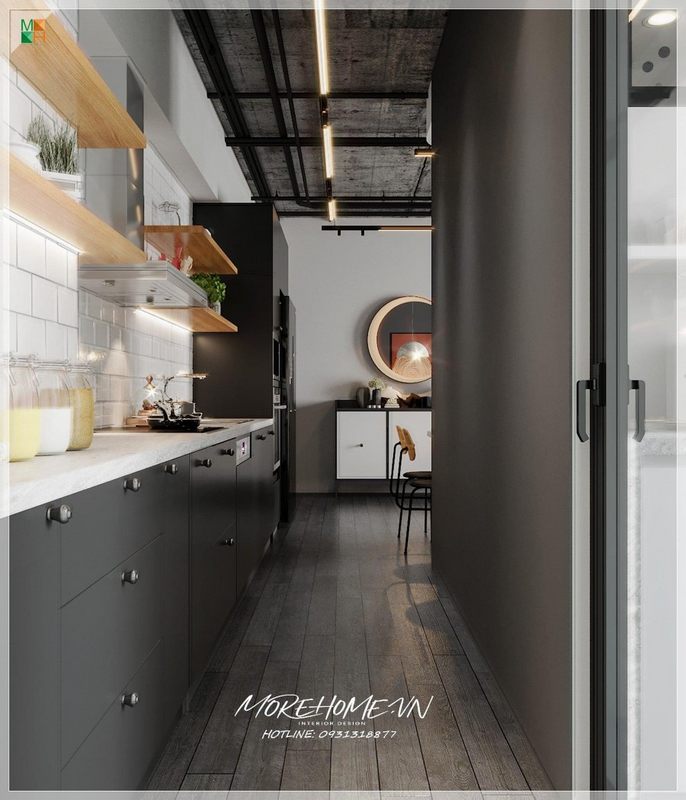 Tủ bếp căn hộ hình chữ nhật tối màu mặt đá ốp bếp màu trắng sẽ làm nên điểm nhấn cho phòng với sự kết hợp giữa giá trị thẩm mĩ cao và tiện lợi.