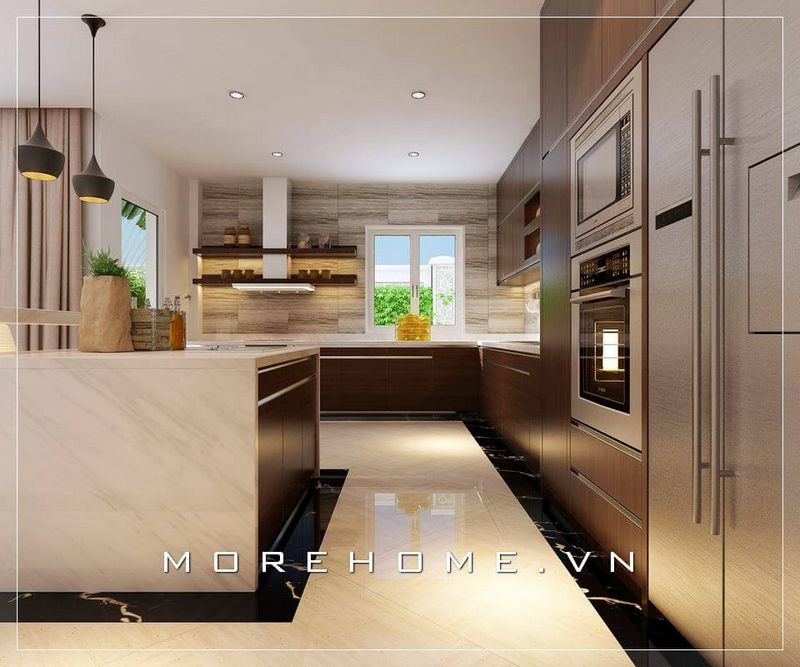 Tủ bếp chữ U theo phong cách hiện đại được thiết kế để phù hợp với nhà biệt thự cao cấp Vinhomes Gardenia.