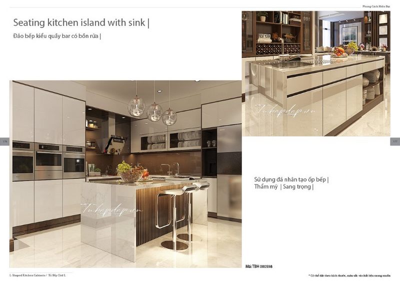 . Tủ bếp công nghiệp hiện đại với thiết kế chữ L, mặt bếp ốp đá trắng cao cấp sẽ mang lại sự sạch sẽ và tiện nghi cho khu vực nấu ăn.